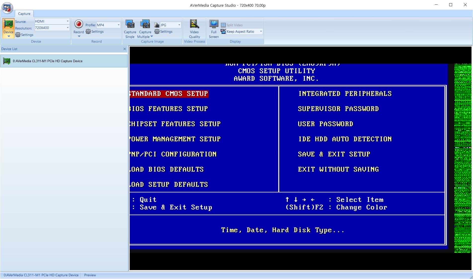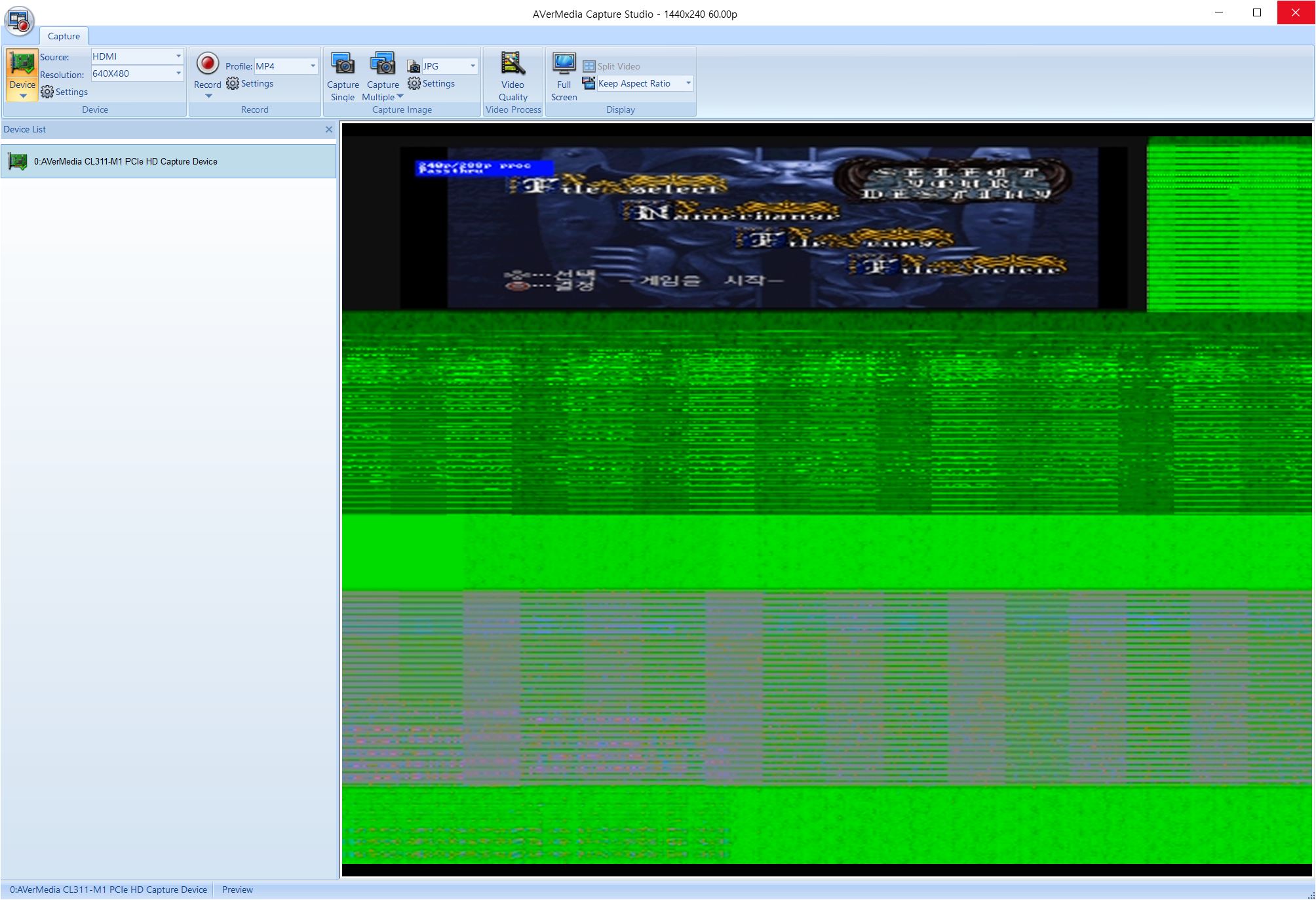 그리고 720x400해상도를 640x480을 거치지 않고 바로 받으면 아래처럼 됩니다. 현지 리솔루션을 1280x1024로 업스케일링되도록 해두었지만 본래 해상도로 해두어도 우/하단에 빈공간이 생기고 깨지는 것은 동일합니다.